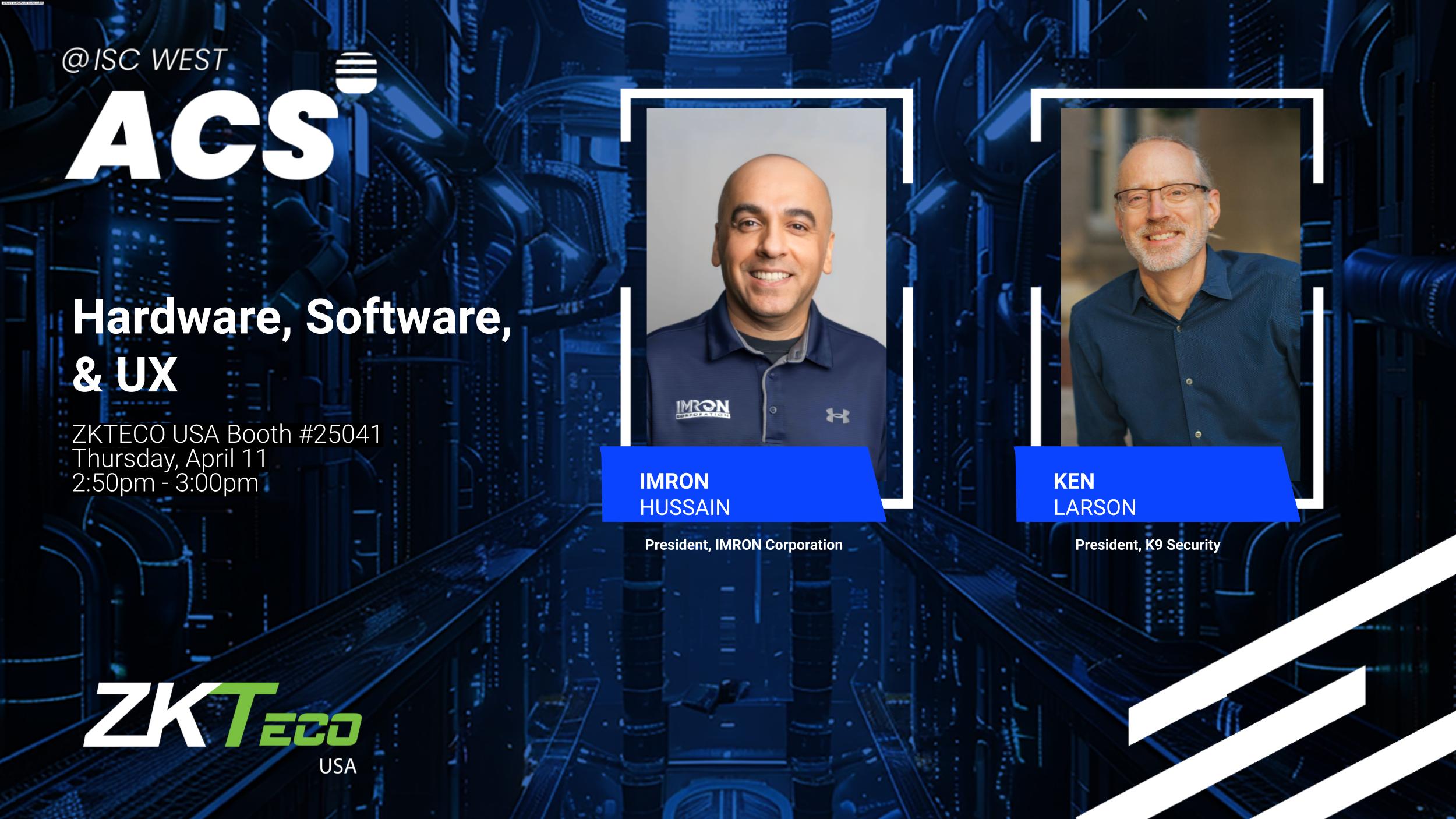 Join Ken Larson from Z9 Security, and Imron Hussain from IMRON Corporation for a chat on the value of user experience and hardware interoperability in the access control industry, at ISC West in ZKTeco USA's booth 25041 on Thursday, April 11 at 2:50pm.